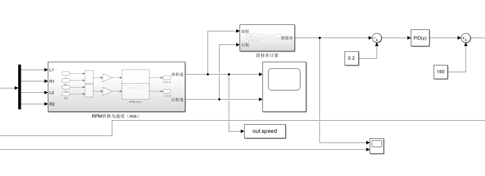 使用前轮速和后轮速计算滑移率,根据实际滑移率与目标滑移率之差,应用PID算法,实现扭矩补偿。