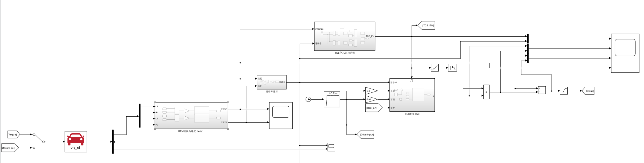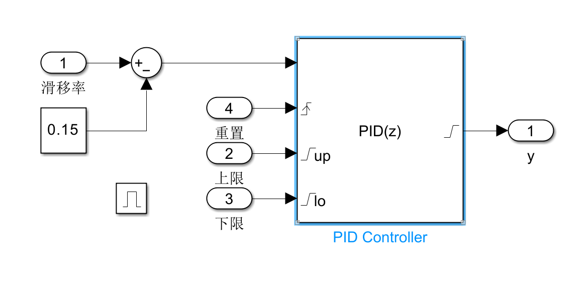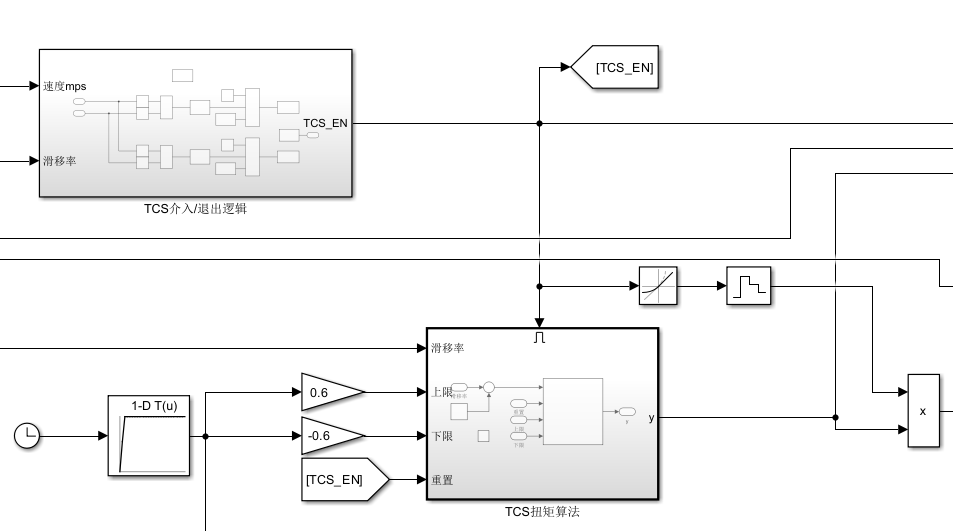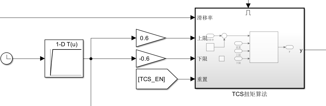 如上图所示,我在PID控制器上添加了外部控制的上下限,和重置信号。上下限是车手输入扭矩的±60%。重置信号来源于TCS的介入信号,下文会详细解释。