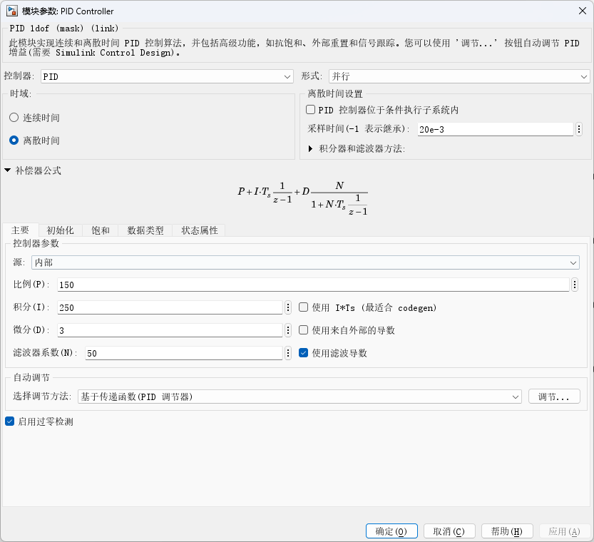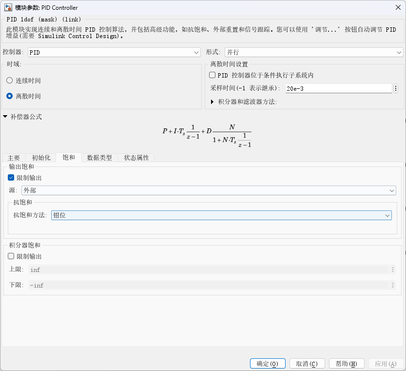 当PID输出饱和时,如果不采取合适的抗饱和措施,PID控制器会一直累计积分项,导致比例项和微分项失去控制意义(被极大的积分项覆盖掉)。应用Clamp钳位的抗饱和方法,控制器会自动停止积分器积分,防止积分项过大影响控制器调控效果。